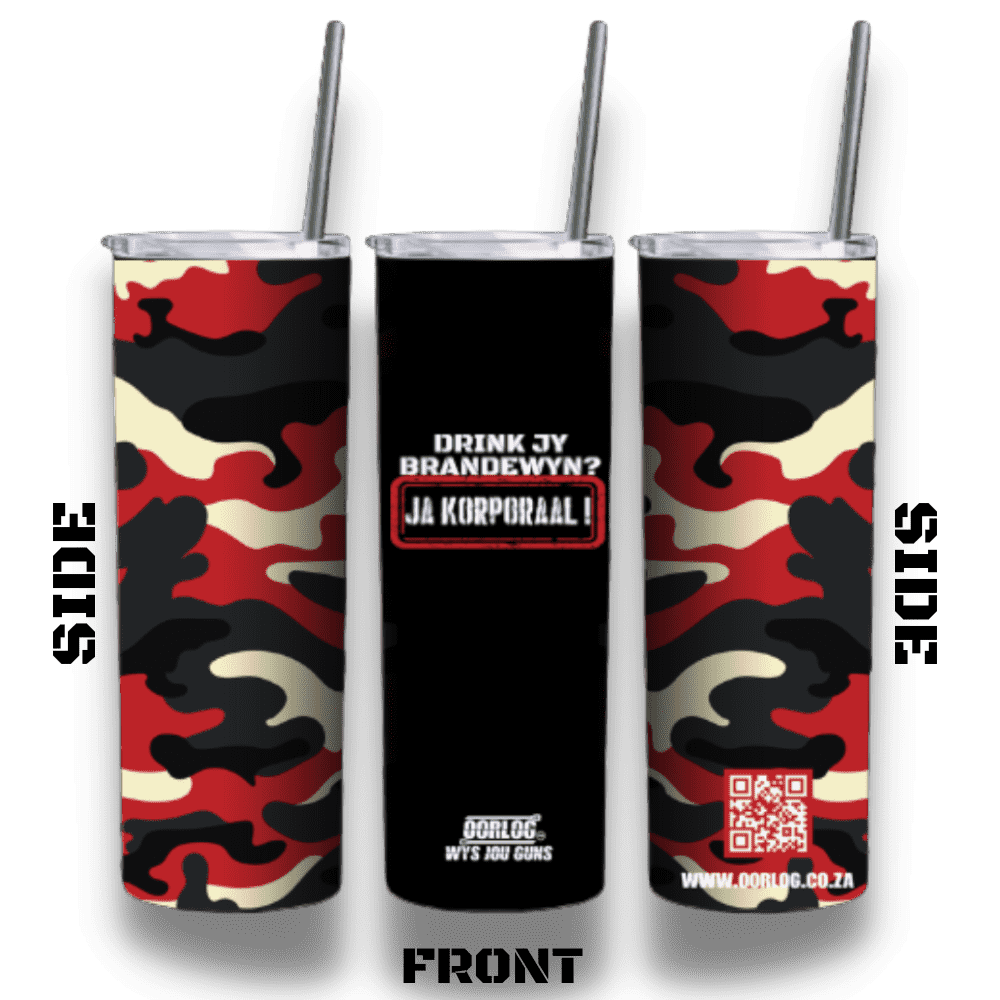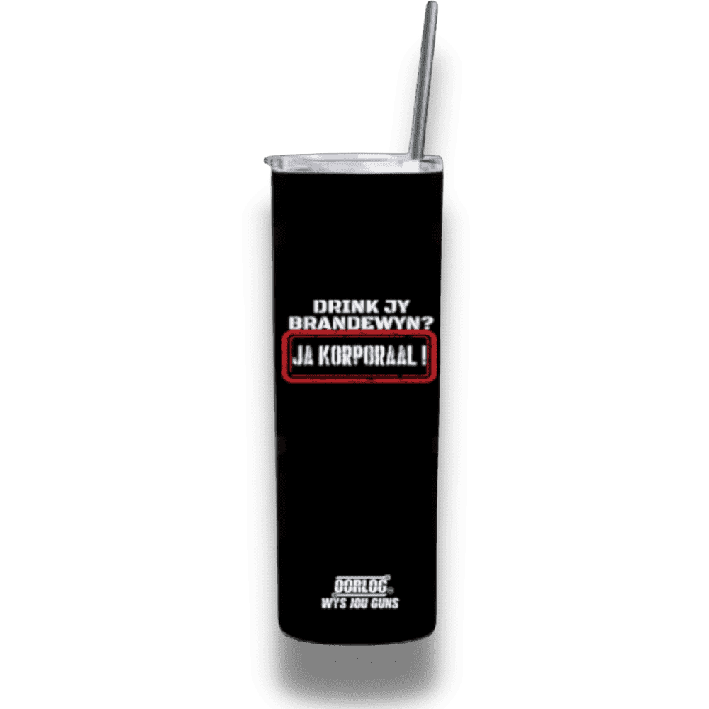 On the tumbler, it says: “drink jy Brandewyn?, Ja Korporaal!”